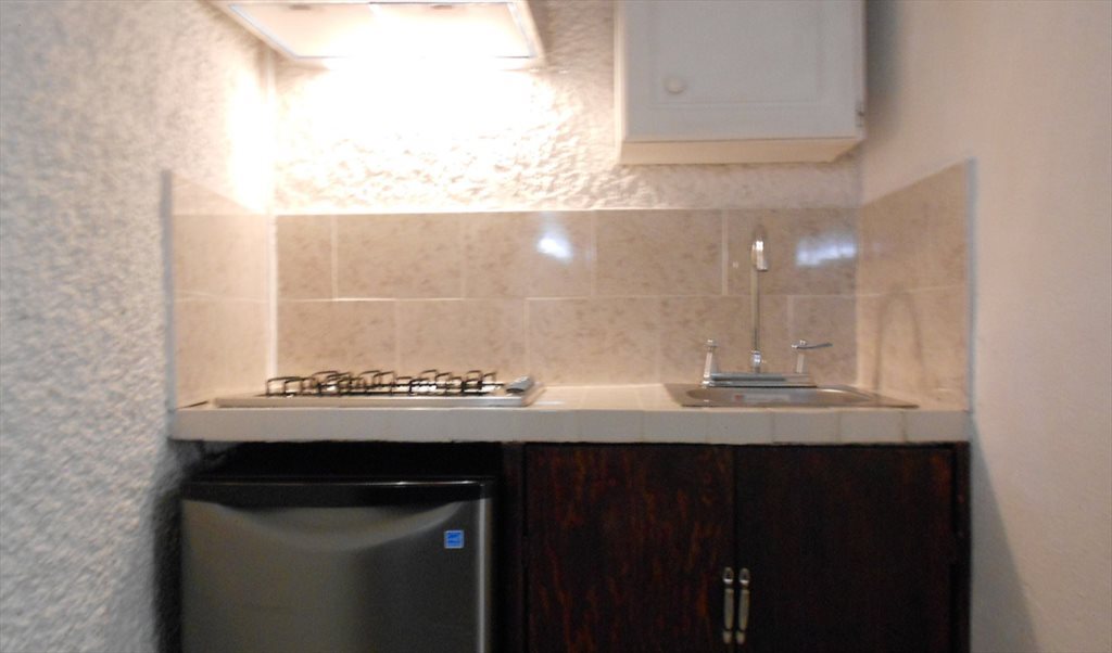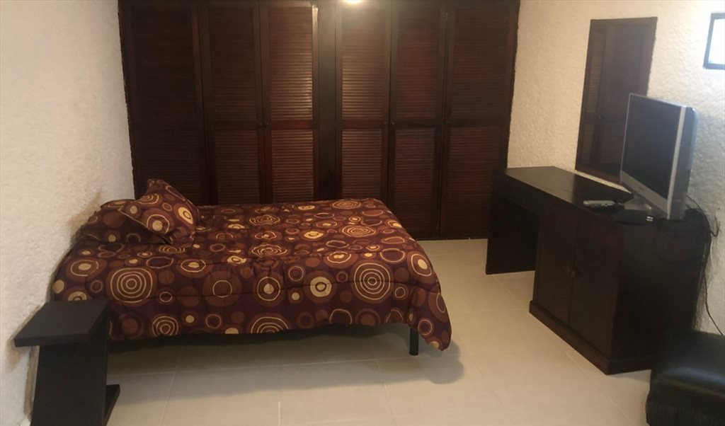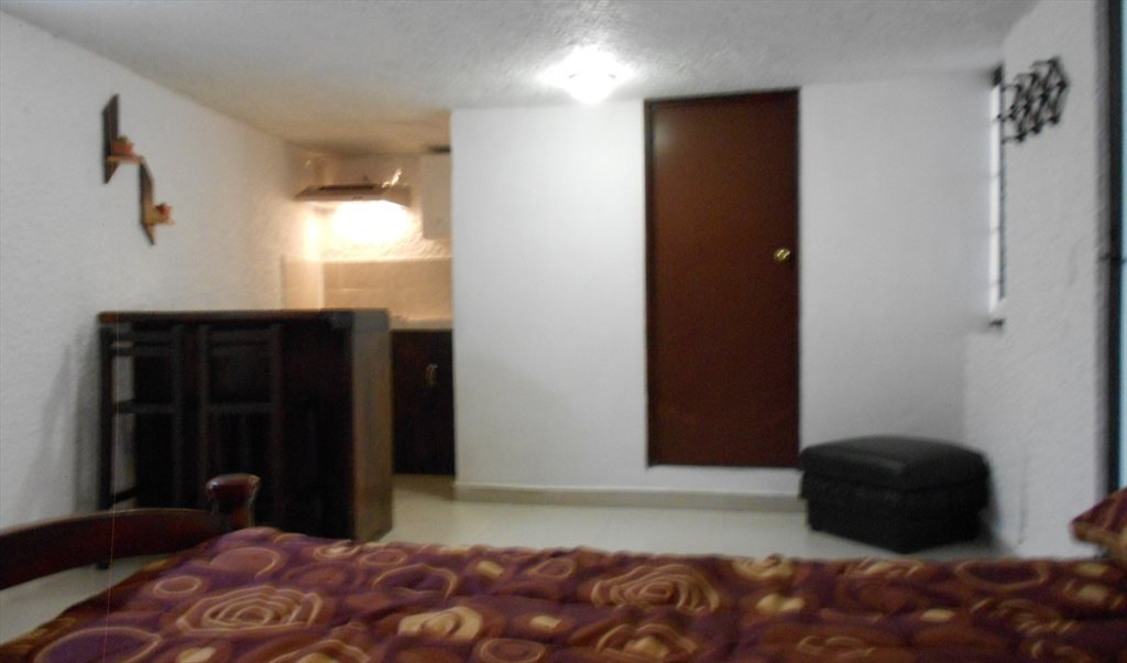 Habitación grande, cuenta con cama matrimonial, colchón lavado y desinfectado, edrecolcha y almohadas, buroe, clóset de pared a pared, baño integrado, tocador, luna, pantalla de 40 pulgadas con roku, escritorio, silla, cocineta la cual se integra de estufa empotrada de cuatro quemadores, frigobar, gabinete, campana con extractor y luz, tarja, barra, dos bancos altos, perchero, mobiliario en excelente estado, área jardinada, incluye: luz, gas, agua, internet, un cajón de estacionamiento cubierto, aseo un día a la semana, los sábados, personas honorables, profesionistas responsables, no fumadores o solo que fumen fuera, no se aceptan mascotas de ningún tipo, estancia mínima de seis meses, el costo es por una persona, persona extra paga agua y gas, se ubica en Fraccionamiento de clase media, con control de acceso, caseta de vigilancia, en la Alcaldía Álvaro Obregón, Ciudad de México, a 20 minutos del metro Mixcoac o Barranca del Muerto o a 25 minutos de Santa Fe.