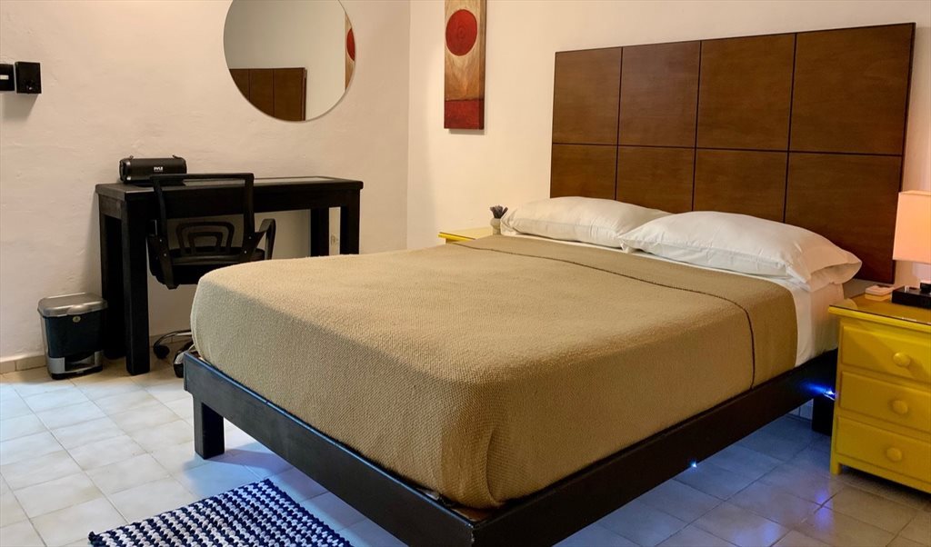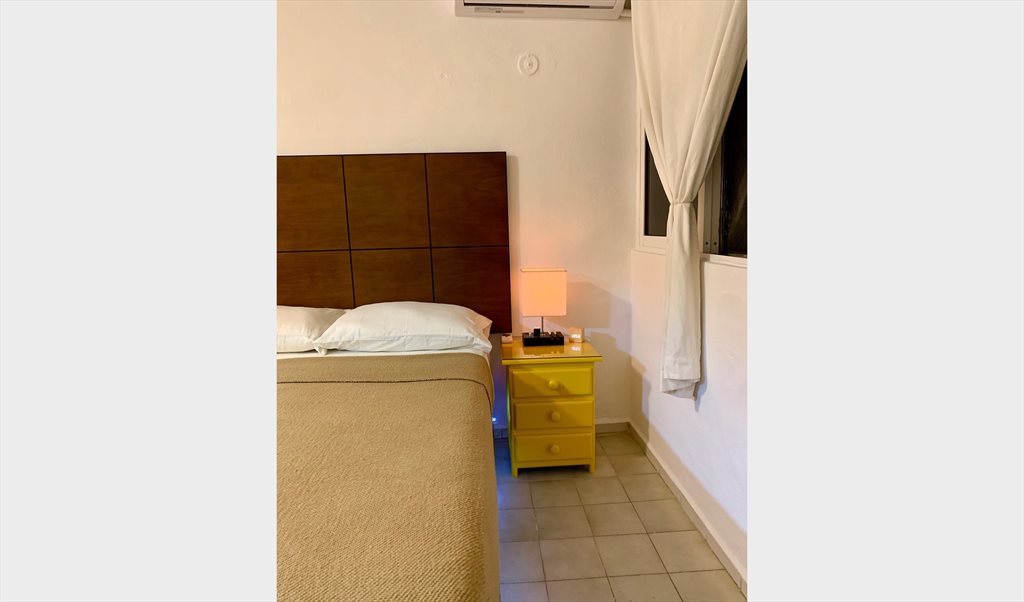 La habitación cuenta con base y colchón matrimonial (equipada con un juego de sabanas), cabecera de madera, ventilador de techo, aire acondicionado tipo mini split, closet abierto de madera, espejo redondo de 80cm en pared, cortina, mesa de trabajo con silla ejecutiva.