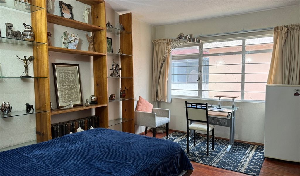 Great location, close to Coyoacan market and downtown. Few min walking from Los Viveros. Bed, big bedroom with light, fridge and big closet. Room cleaning once per week included. Quite and safe. Internet and utilities included. Ability to use the kitchen and laundry.