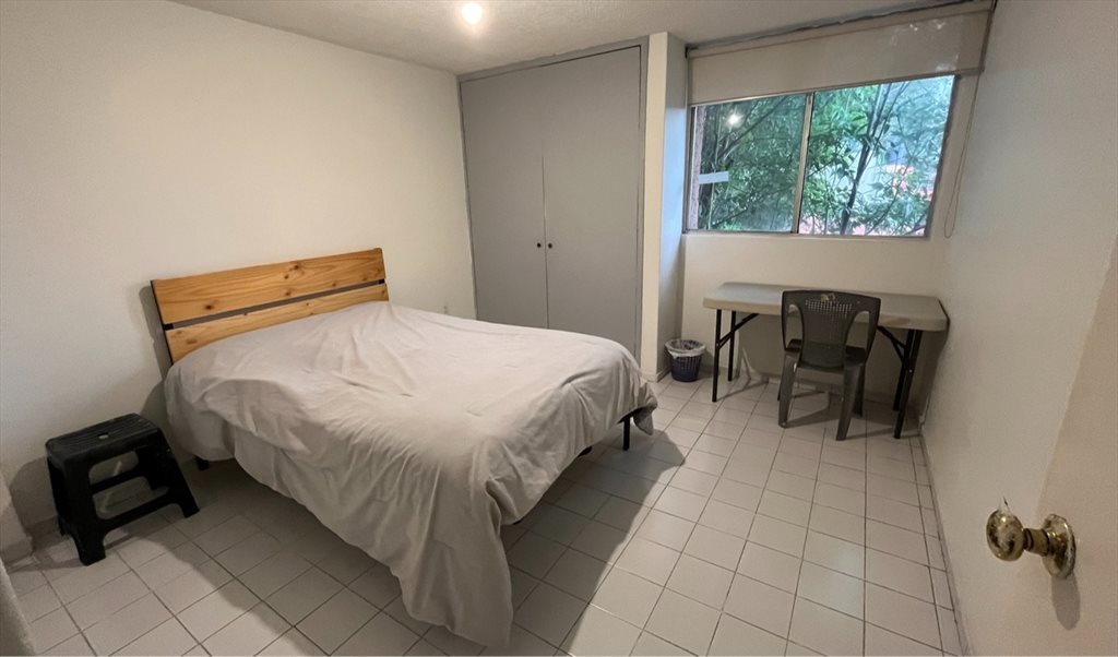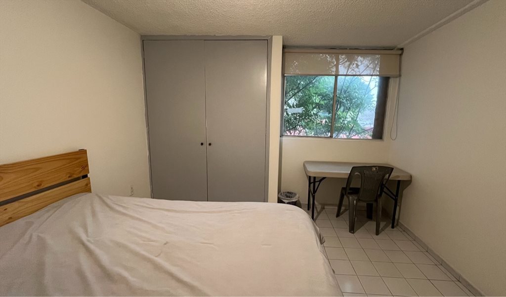 La habitación es amplia y muy iluminada, cuenta con closet, cama matrimonial y una mesa/escritorio. El baño es compartido con una persona. Las áreas comunes son amplias y están amuebladas. Estacionamiento disponible por un costo extra.
