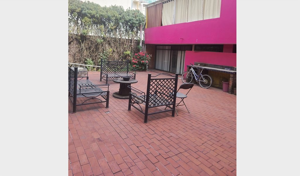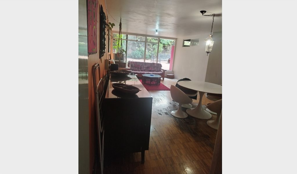 La habitación esta dentro de una casa, cuenta con sala/comedor, y un jardin exterior. La casa cuenta con cocina equipada, estufa integral y refrigerador. Tiene todo lo necesario para llegar y relajarte. Tiene en frente un parque divino donde puedes ir a correr sin problemas y estación de bici.