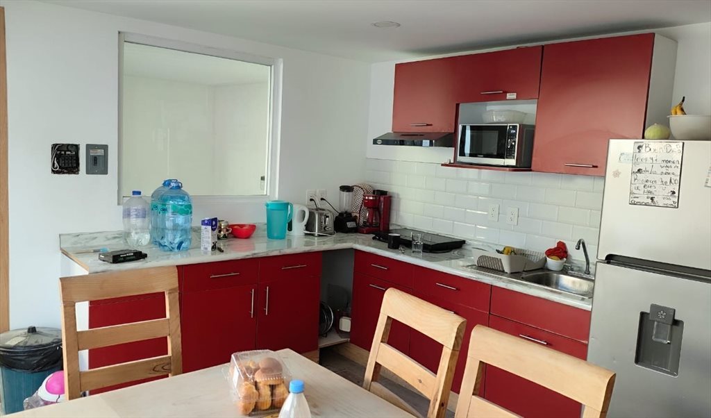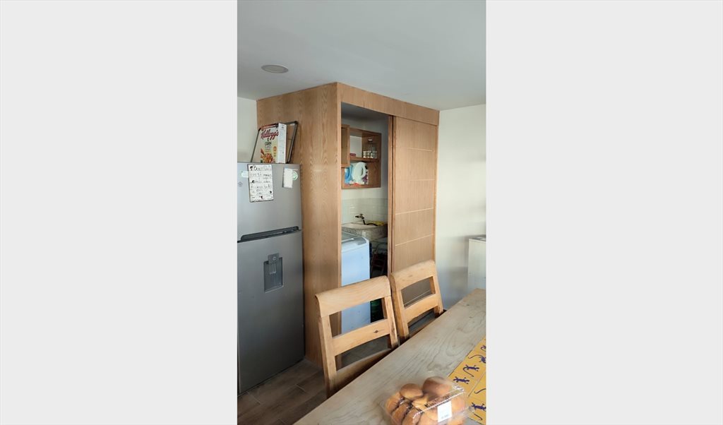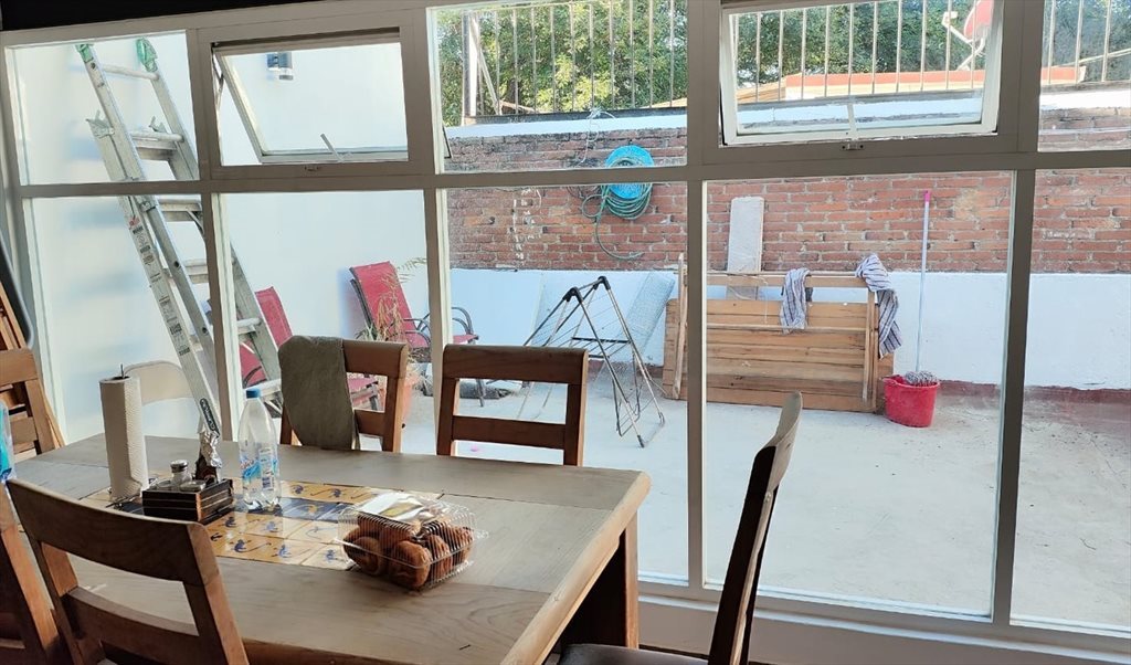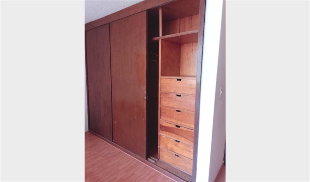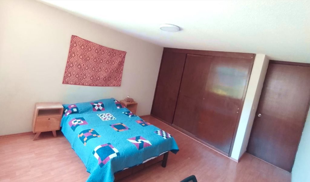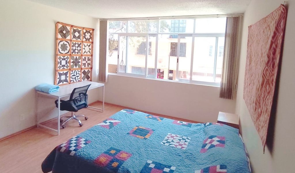 Habitación grande con clóset, cama matrimonial, burós, escritorio y silla. El baño es compartido con otra persona. Es una casa de 4 habitaciones y un estudio. En la parte alta tienes una cocina y lavadora a compartir con las otras 3 habitaciones. Hay una azotea con una mesa y zona de secado de ropa. Hay un gato en la casa.