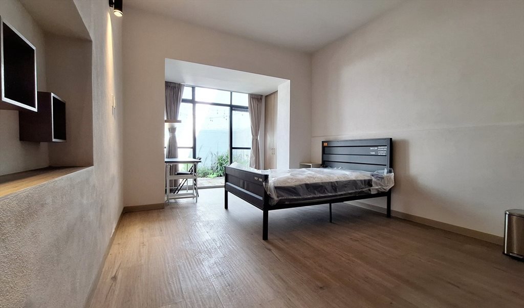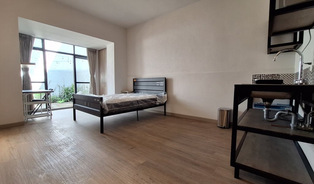 Esta habitación tiene salida directa al jardín, cocineta, cama matrimonial, escritorio y baño propi, clóset. Cortinas de dia y blackout.
