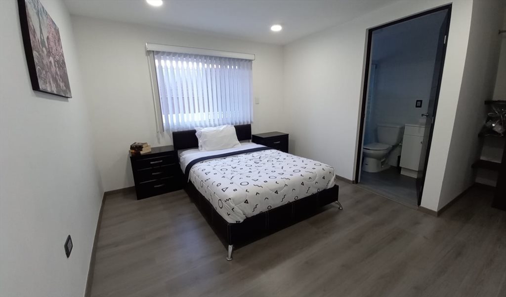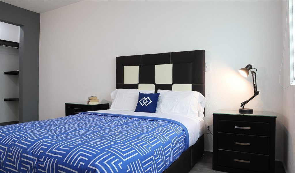 2. Habitación amueblada con una pantalla plana 32", cama matrimonial con buró, Almohadas, Edredón ligero, Closet y decoración, es decir, todo listo para mudarte.