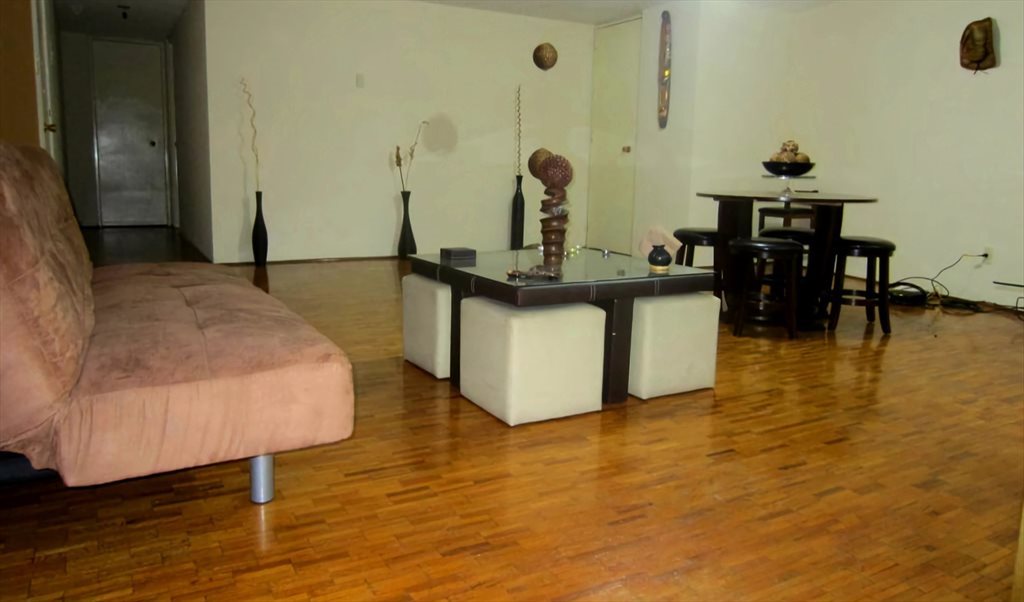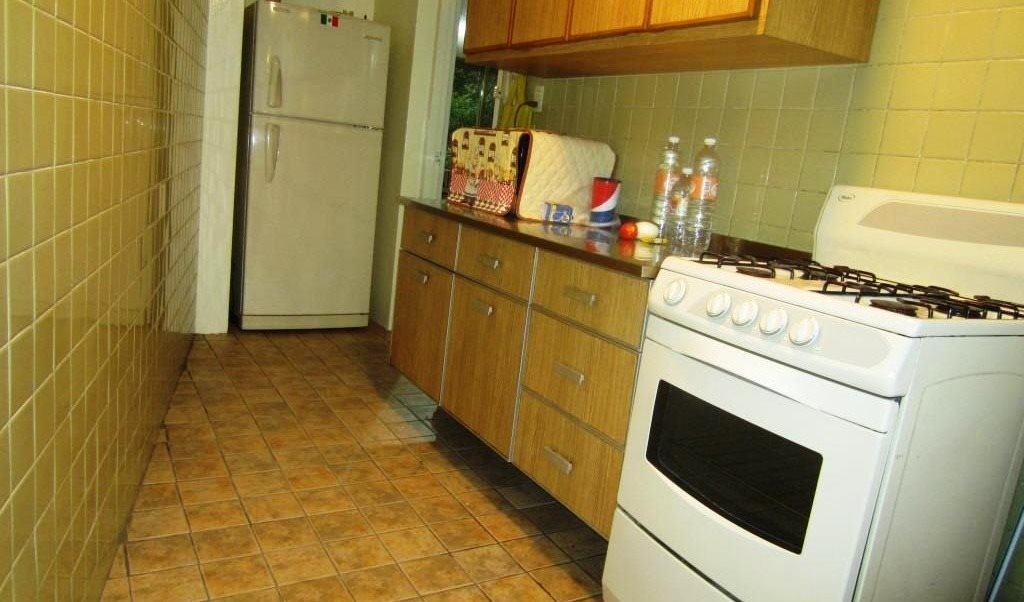 El depa está totalmente amueblado. La cocina tiene estufa con horno, horno de microondas, refrigerador y todos los implementos necesarios si te gusta cocinar. Si lo necesitas también puedes tener estacionamiento con un cargo extra.
