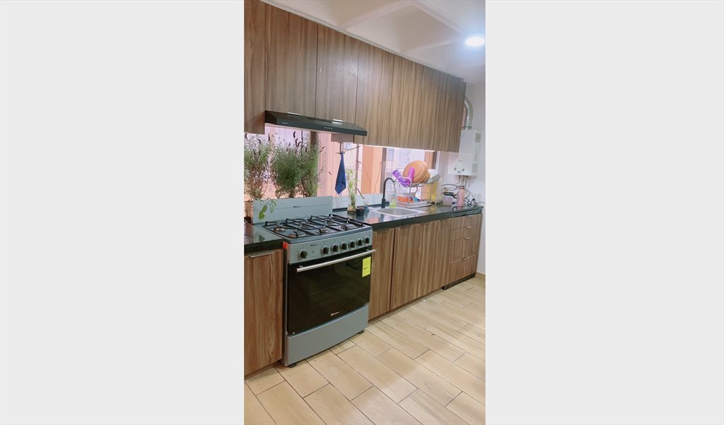 El departamento cuenta con espacios abiertos, cocina integral con comedor y una pequeña sala. Esta habitación comparte baño con 3 personas y cuenta con lavadora en la azotea en la jaula de tendido, está techado para no salir corriendo si hay lluvia.