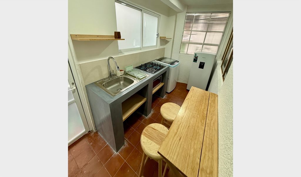 Cocina compartida: refrigerador, microondas, lavadora, parrilla, tarja, desayunador, bancos.