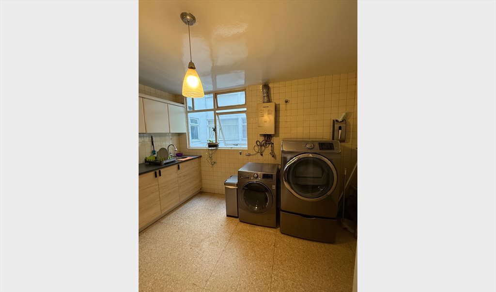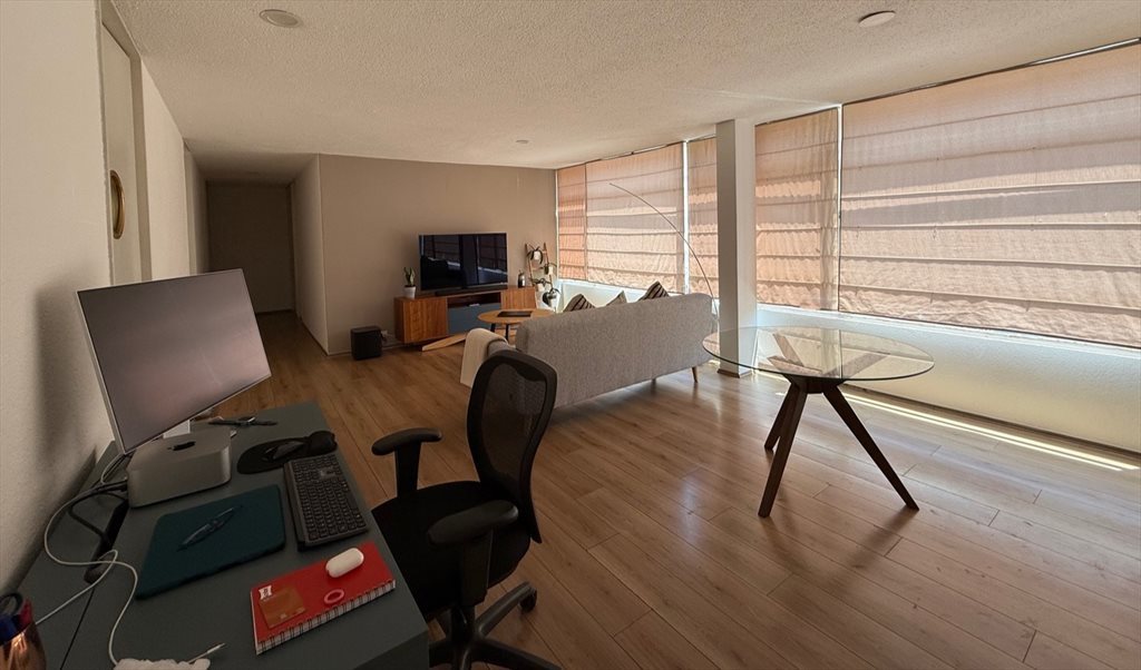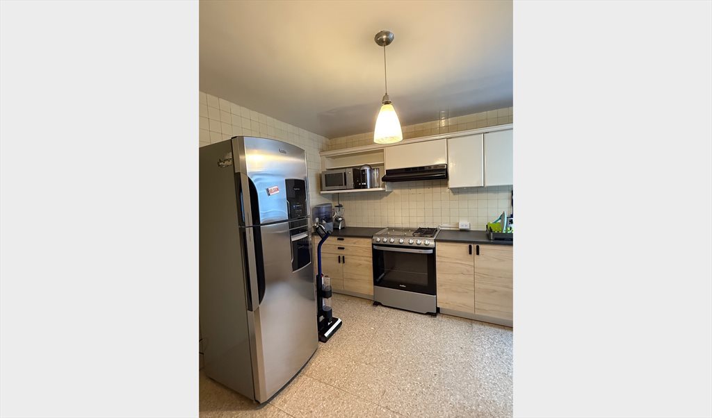 El depa es muy iluminado y tiene una extensa sala, comedor que da al exterior, cocina totalmente equipada, trastes, refri, horno, cafetera, etc. Se cuenta con lavadora, secadora y jaula de tendido.