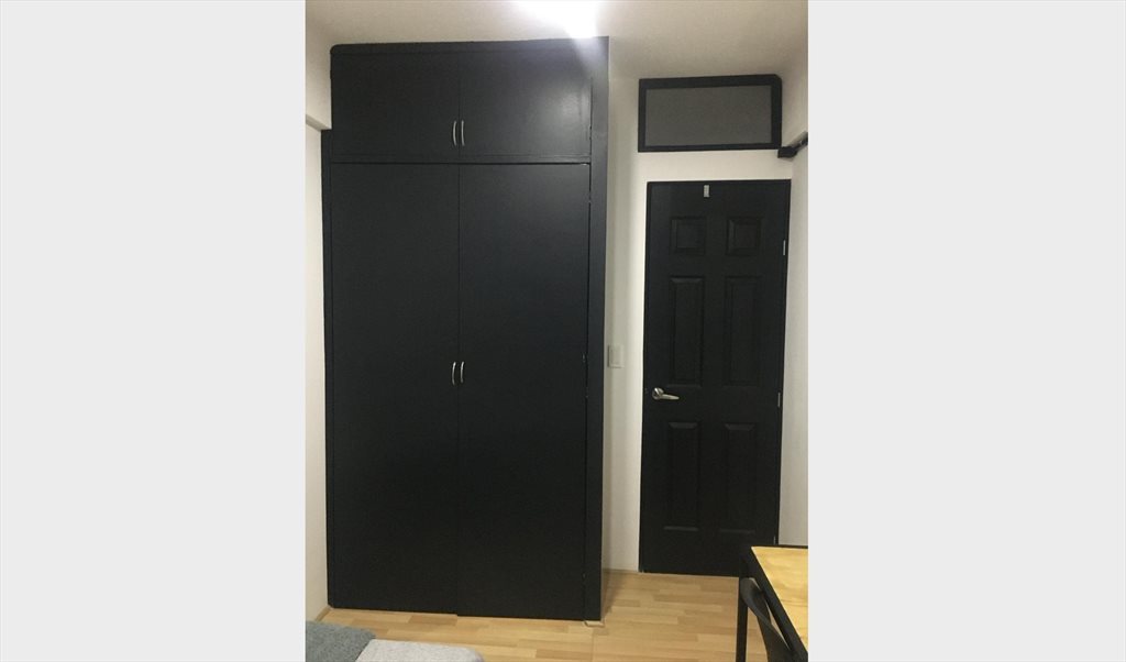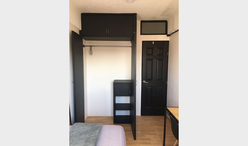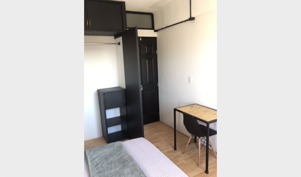 El cuarto cuenta con closet, cama individual, buró y escritorio.