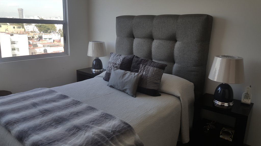 rentó habitación amplia, soleada, esta totalmente amueblada, tiene baño privado. Es un excelente departamento con magnifica ubicaciòn y buenas vías de acceso. El edificio cuenta con alberca, gimnasio, Business Center, jacuzzi, roof garden ideal para una carne asada o una velada nocturna, también cuenta con salón de eventos.