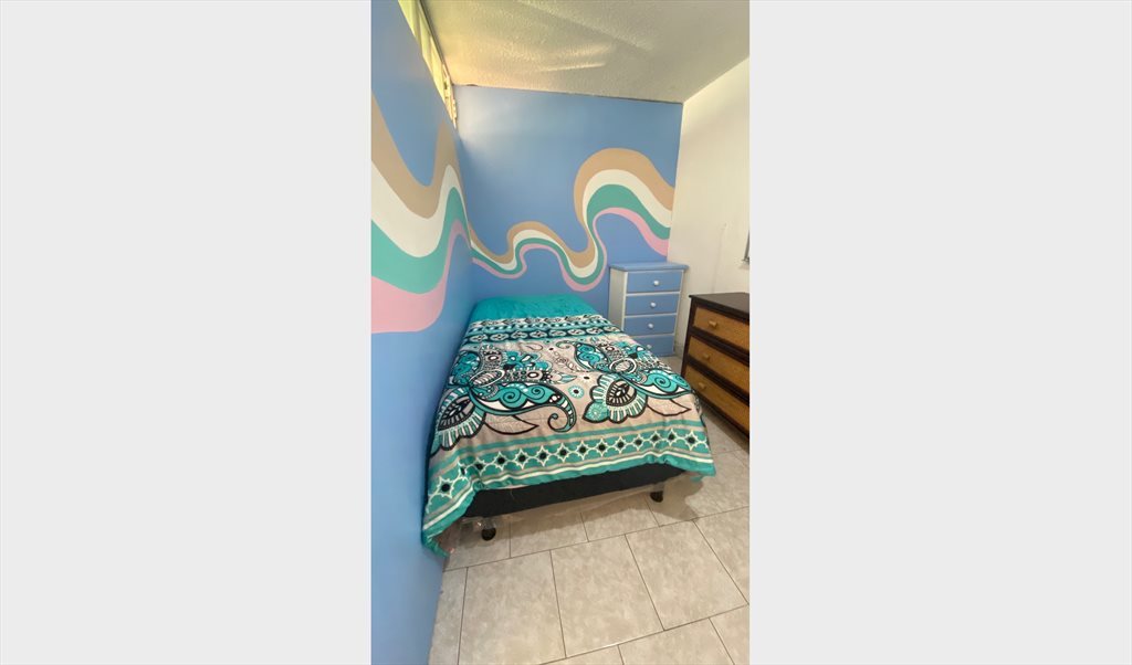 Es una habitación acogedora, está amueblada (🛌cama individual y ropero).