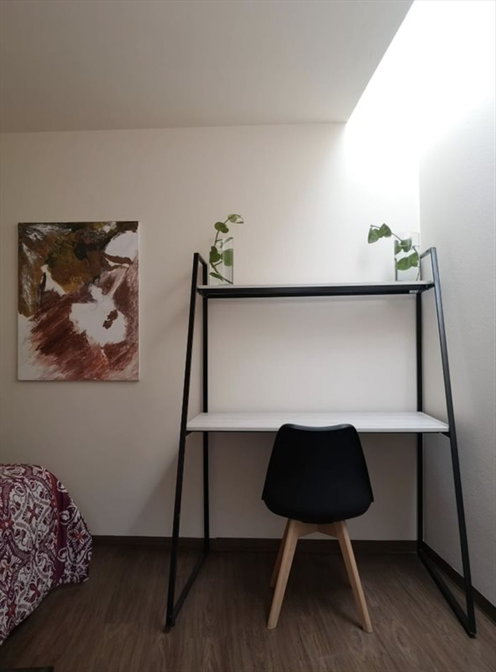 Single room, with a desk, closet and private bathroom.
