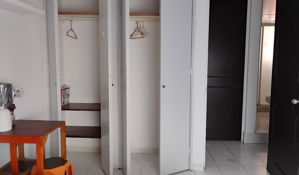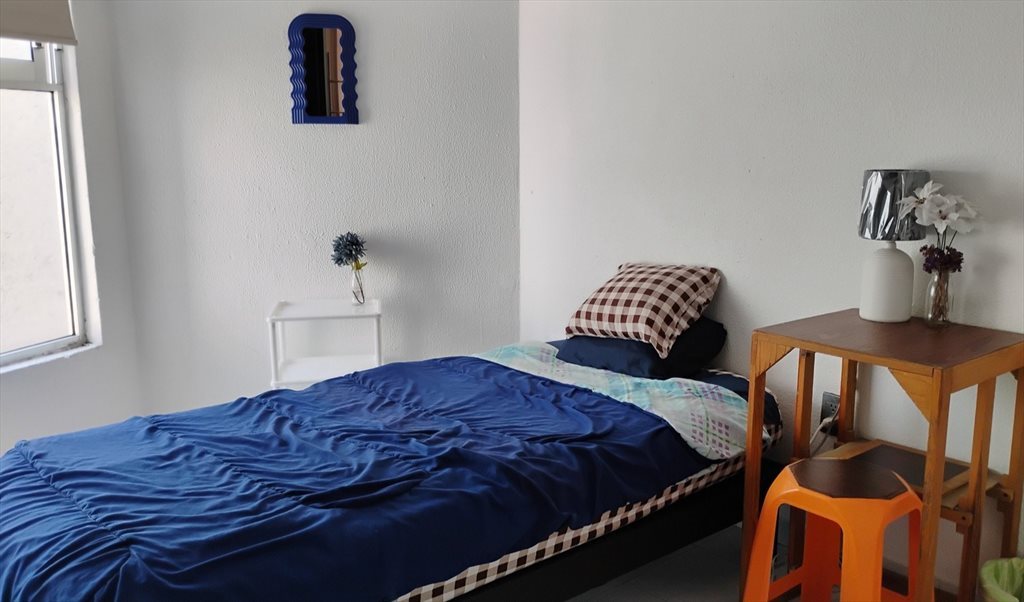 --Una cama individual con su respectiva ropa de cama –cubre colchón, sábana, edredón, almohada con funda, y cojín, todo completamente limpio y sanitizado--, ropero de 2 puertas, mesita-buró con banquito, y lámpara de noche, estante con 3 repisas, espejo, estructura para montar Pantalla de TV, y Cortina enrollable
