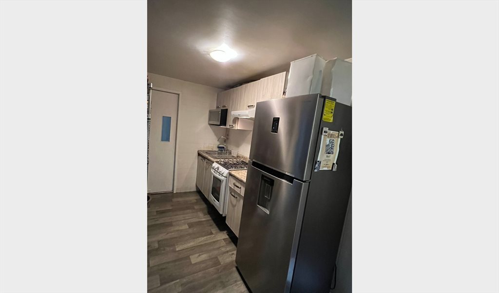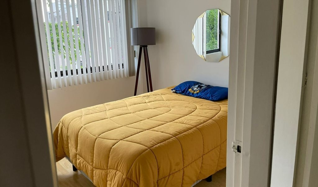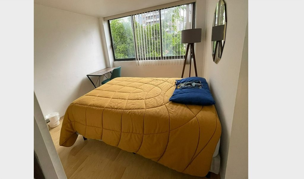 La habitación está amueblada con closet de 3.5x3.5. Baño compartido. Hay señora de la limpieza una vez por semana.
