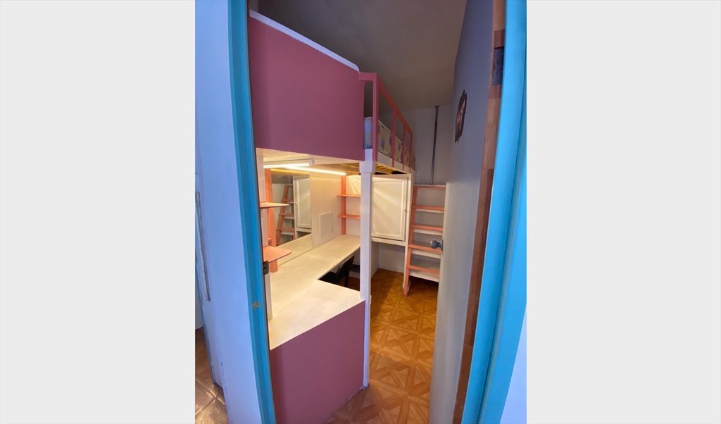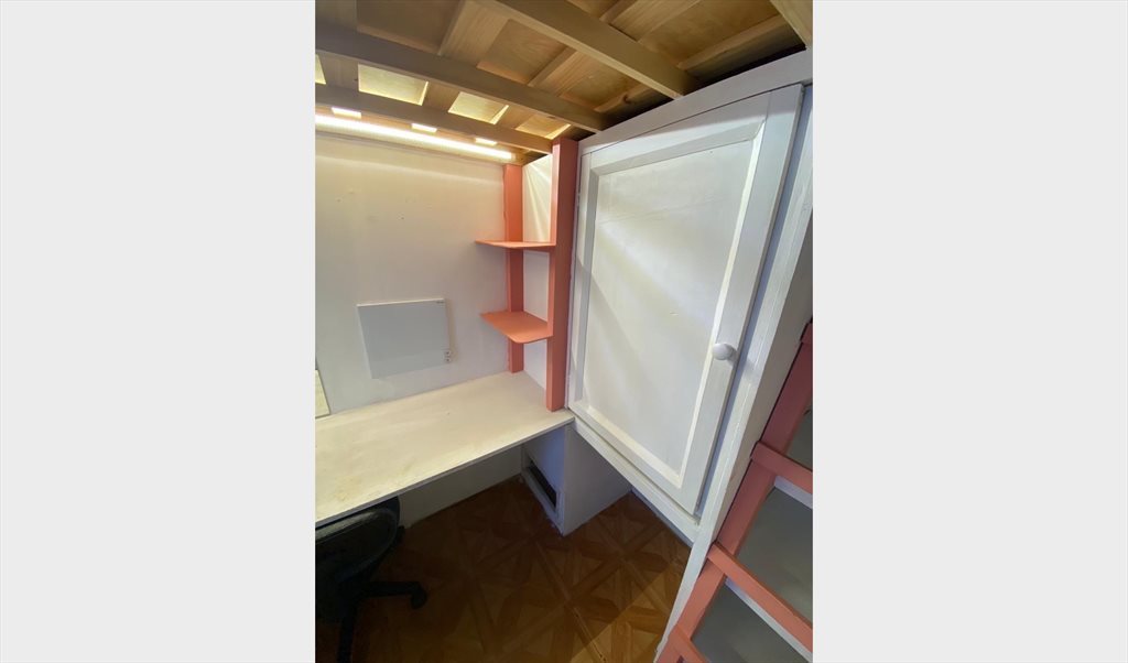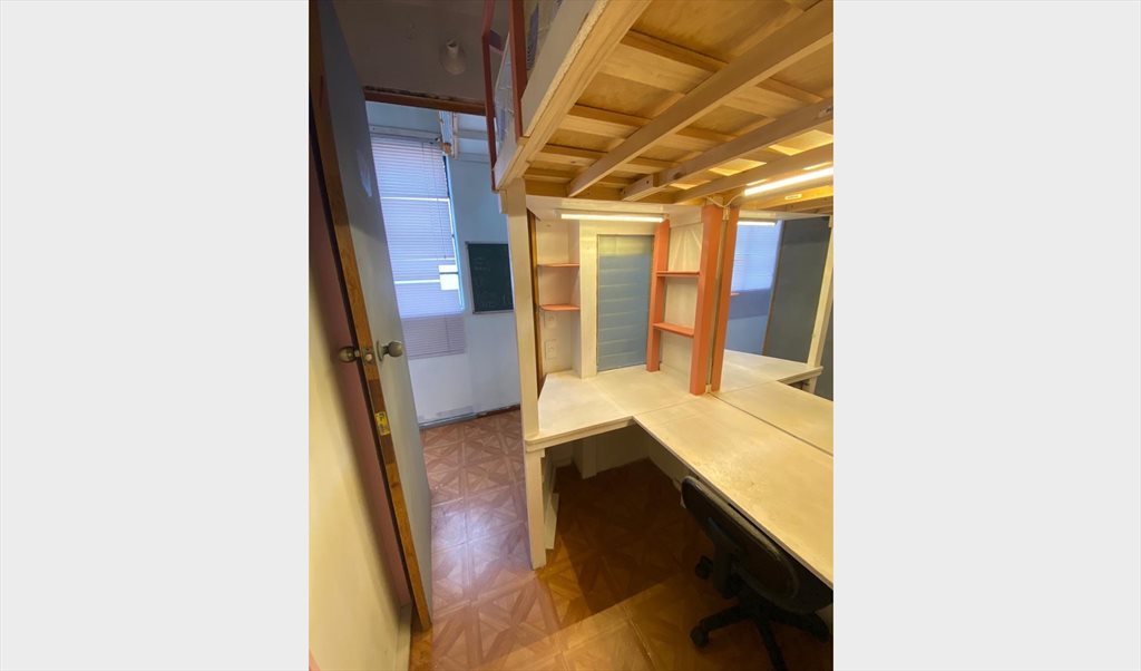 el departamento internamente está dividido en 3 mini recámaras individuales adaptadas como estudio, cada división tiene: cama individual tipo litera, escritorio amplio bajo la litera con estantes, con iluminación potente, closet y cajoneras, escalera para subir a la cama ( y la escalera se usa como librero ), y arriba en la cama tienen un baúl para Guardar la ropa de cama y otras Cosas, contactos individuales y apagador de luz en escalera para que al subir a la cama se pueda apagar la luz desde arriba, la recámara tiene su propia puerta de acceso con llave. ( una de esas divisiones es la que está disponible )