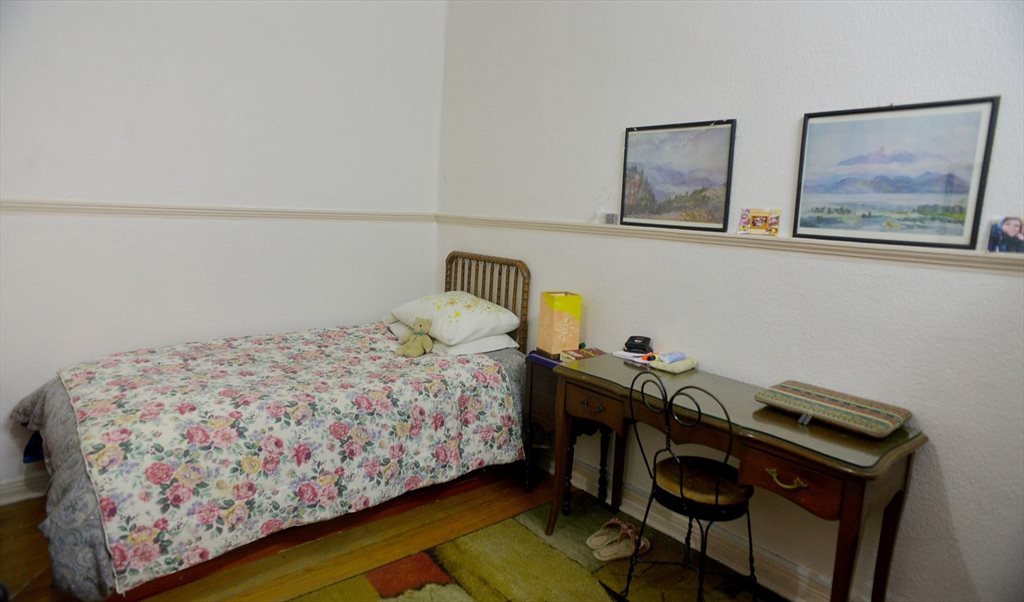 Una recámara pequeña interior, con cama individual, armario y burós.