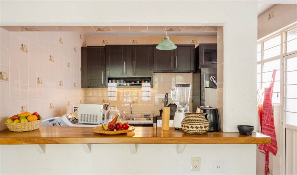 La sala comedor es amplia e iluminada, la cocina esta totalmente equipada ( Horno, microondas, cafetera, lavadora, secadora) también área para tender ropa. Hay muchas plantas y un balcón donde se puede desayunar muy a gusto.