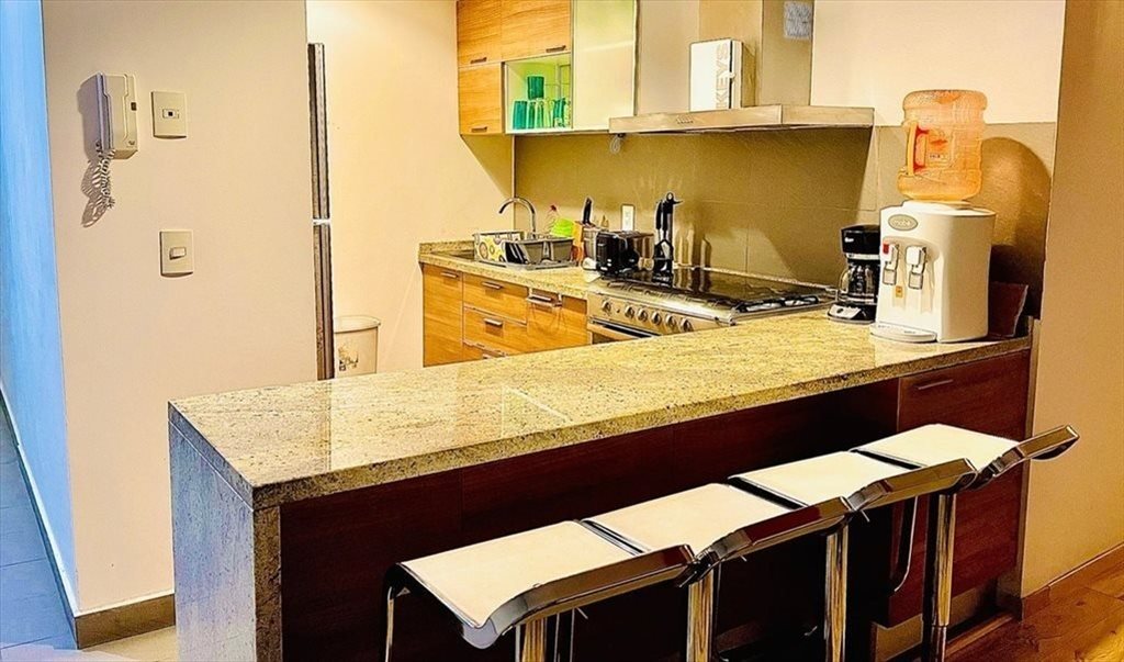 Áreas Comunes: Sala, Comedor , Cocina 100% equipada (refrigerador, fregadero, estufa de 4 quemadores c/ horno, microondas, ollas, sartenes, cubiertos y utensilios para cocinar, aparatos electrodomésticos básicos y vajilla para 4 personas. licuadora, cafetera, café incluido y tostadora.