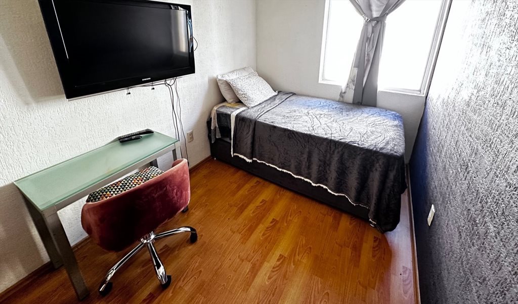 Tenemos 1 habitacion con cama individual, TV con todas las plataformas funcionando y escritorio con silla,