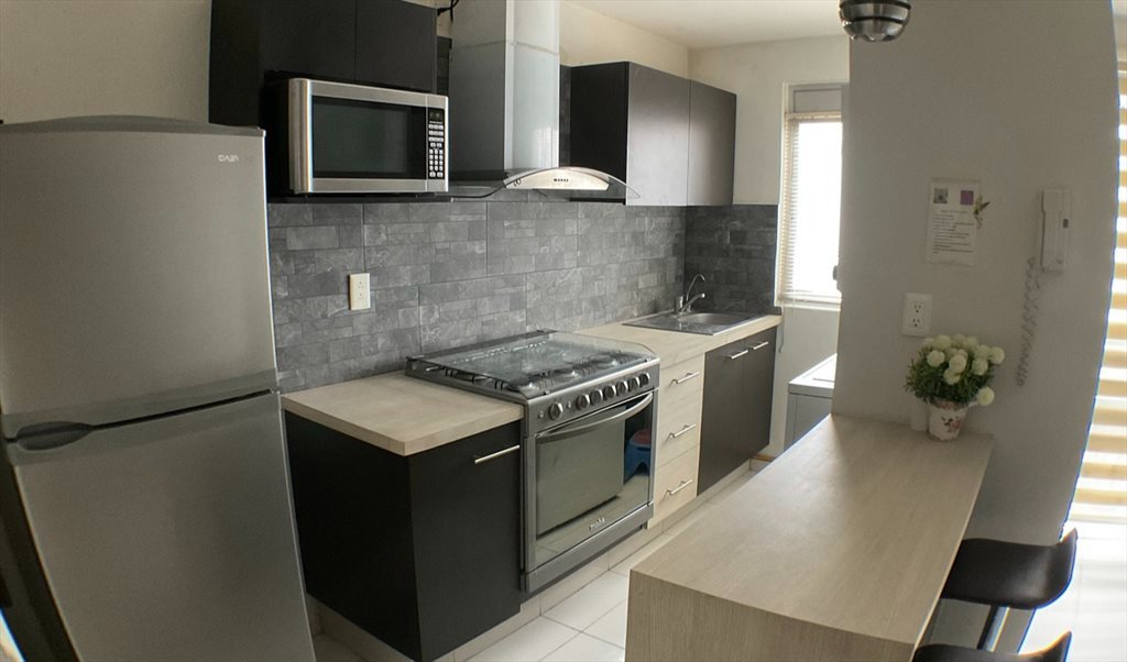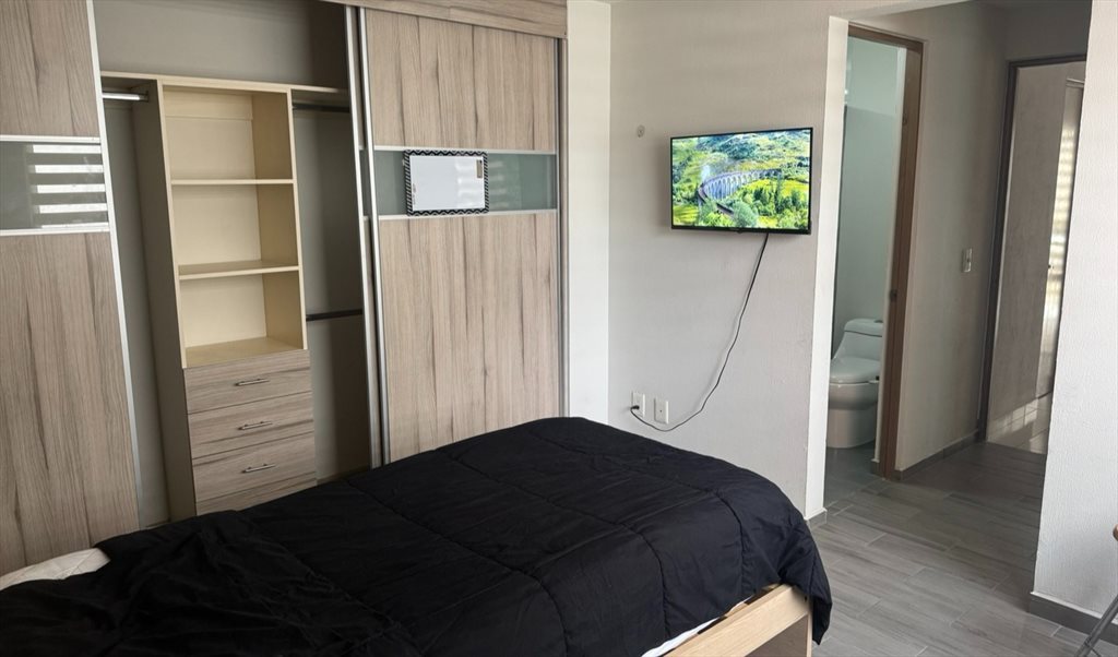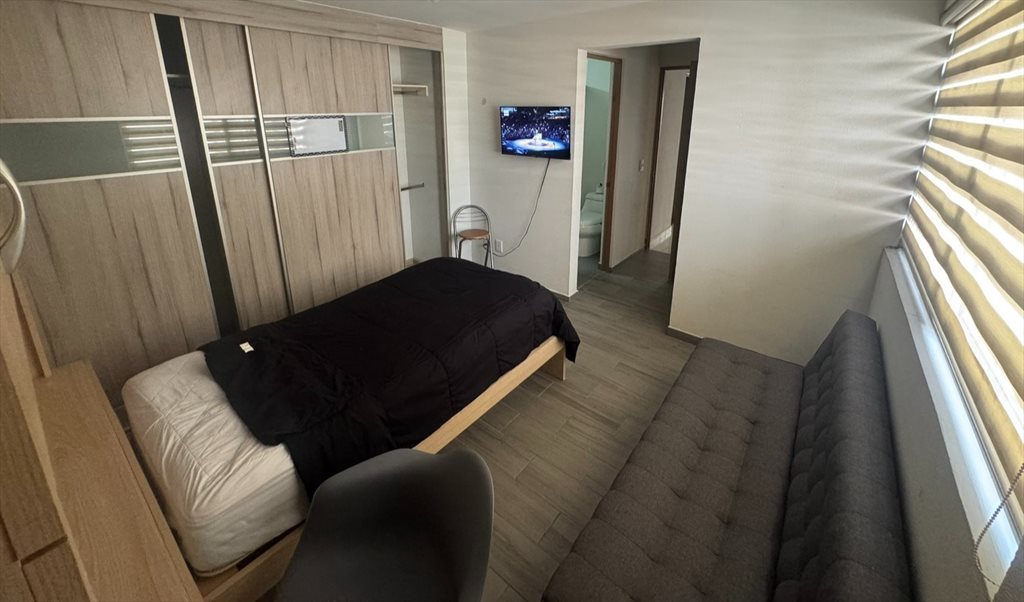 Habitación principal disponible con baño propio, se entrega completamente amueblado, con cama, escritorio con mueble librero, silla, sofa cama, sillón, pantalla SmartTV 32”, closet, espejo de pared, persiana y lámpara de buró; barra comedor con bancos ajustables; cocina equipada con refrigerador, estufa, horno de microondas, licuadora, vajilla, tazas, sartenes, ollas, filtro de agua, área de lavado, centro de lavadora y secadora, ventanas con persianas, instalación eléctrica con lámparas e interfon; y pasillo de acceso, lo que significa que no tendrás que preocuparte por comprar muebles ni equipamiento adicional. Solo necesitarás traer tus pertenencias personales para disfrutar de tu nuevo hogar.
