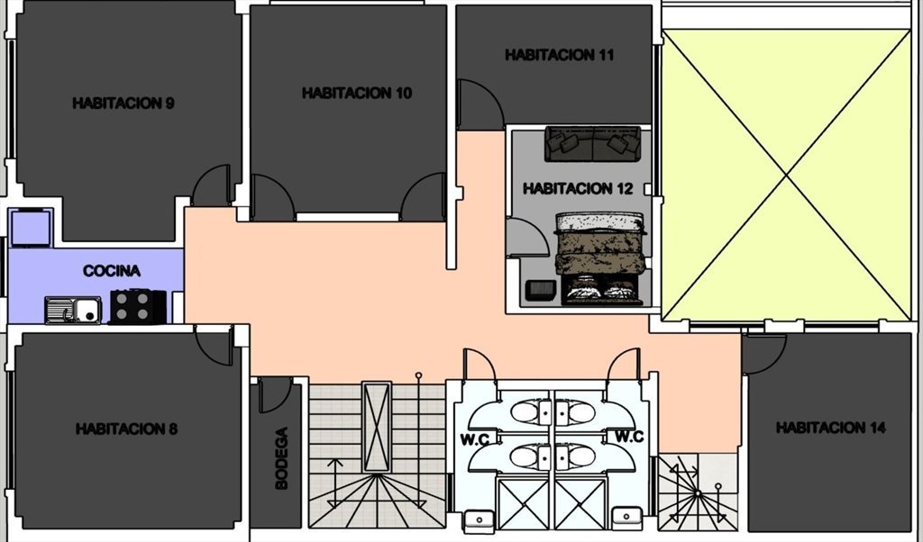 Áreas sociales por nivel (el edificio cuenta con 27 habitaciones distribuidas en 3 niveles, cada uno con su propia área social):