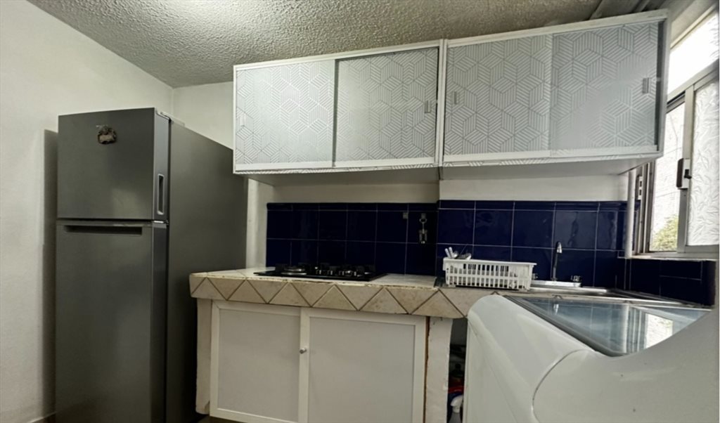 Departamento con area de sala, comedor, cocina, refrigerador, micro, alacenas, las 3 habitaciones amuebladas cada una con clóset, estantería, mesa de trabajo, silla, smart TV, base de cama con cabecera y colchón individual nuevo, hay 1 baño (COMPARTIDO para los tres residentes), lavadora y secadora de ropa en el departamento; calentador de paso con presurizador de agua.