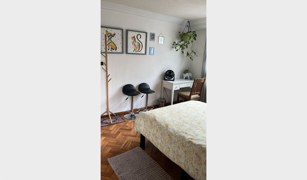 La habitación disponible para Mujeres es amplia y muy buen iluminada. Tiene una cama matrimonial y un clóset muy amplio. Tiene un espacio con escritorio para trabajar. Tiene un balcón con plantas y el espacio es amplio y acogedor.