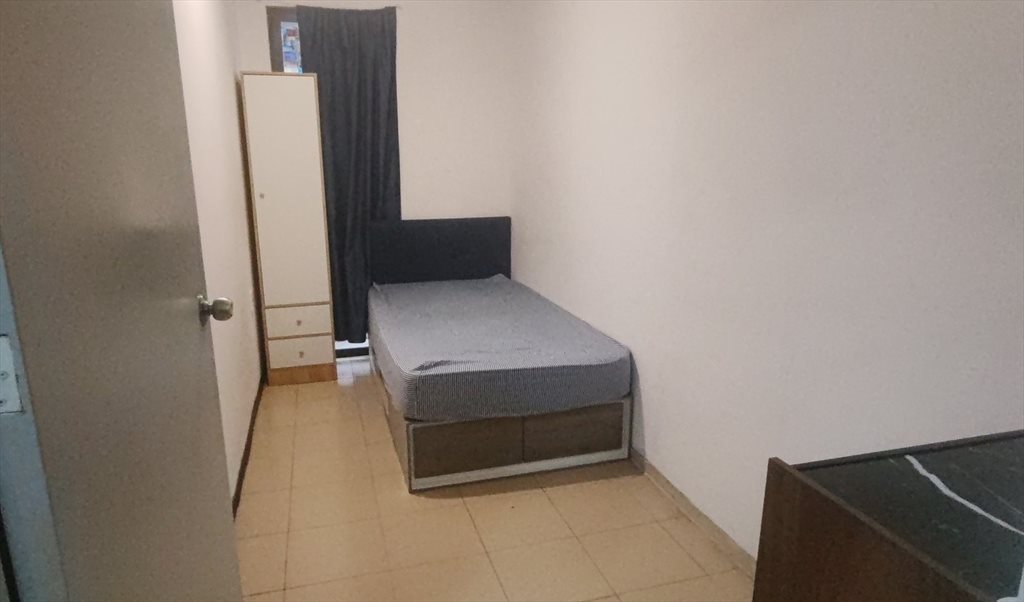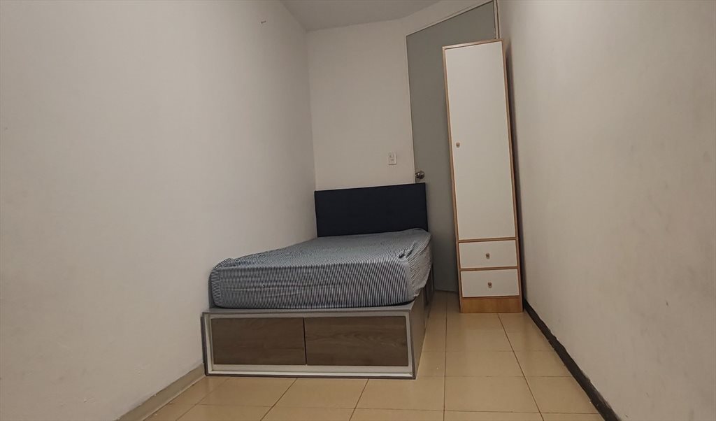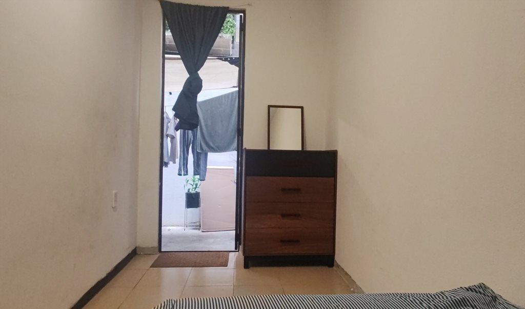Habitación con cama individual, colchón, closet pequeño y cajonera. El departamento esta en plata baja. Se comparte cocina, patio y Baño.