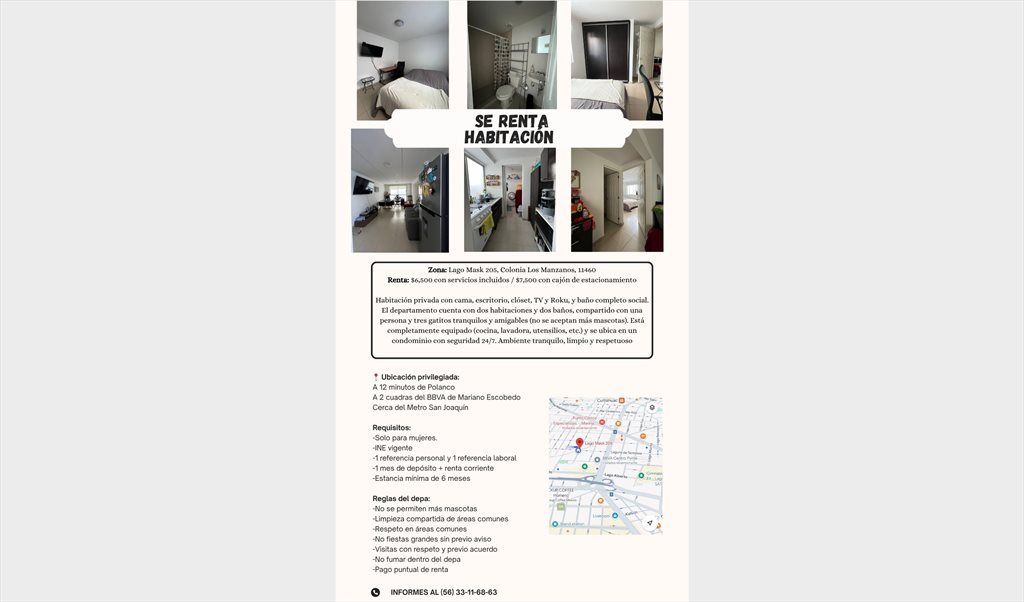Renta: $6,500 con servicios incluidos / $7,500 con cajón de estacionamiento