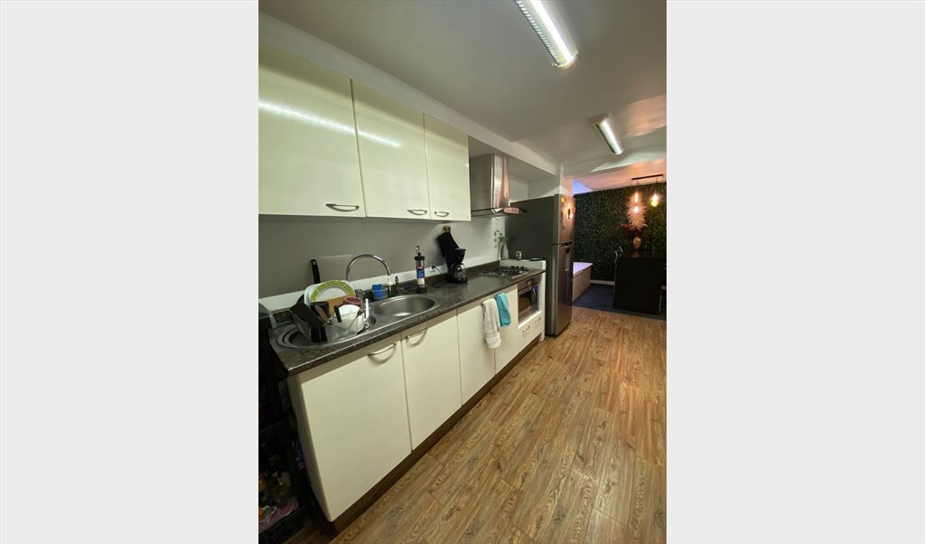 El depa tiene lavasecadora, cocina equipada, sala, barra desayunadora y está tranquilo ya que es interior y planta baja.