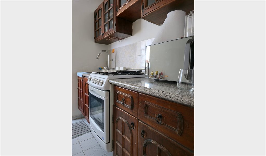 El departamento es pequeño pero cuenta con un baño, sala, comedor, cuarto de lavado con lavasecadora y cocina equipada con todo lo necesario: microondas, refrigerador, licuadora y estufa con horno.
