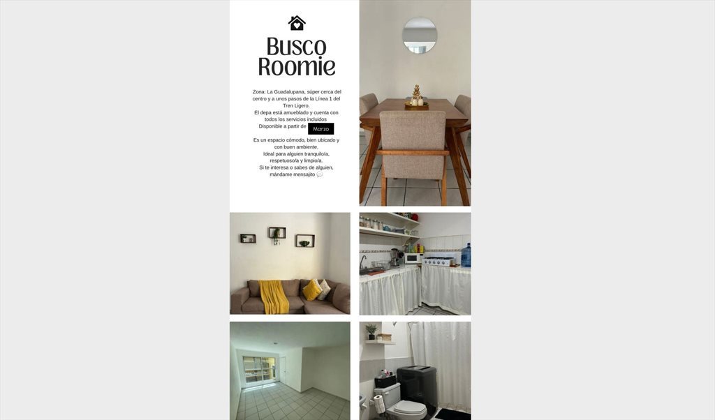 Sobre mí: Soy una persona [tranquila / limpia / que trabaja fuera], me gusta el respeto a las áreas comunes y busco a alguien con vibras similares.