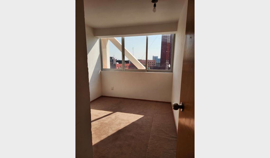 La recamara de 2.50 x 3.40 m, cuenta con un closet amplio instalado, alfombra y ventana con linda vista hacia varios edificios de Reforma.