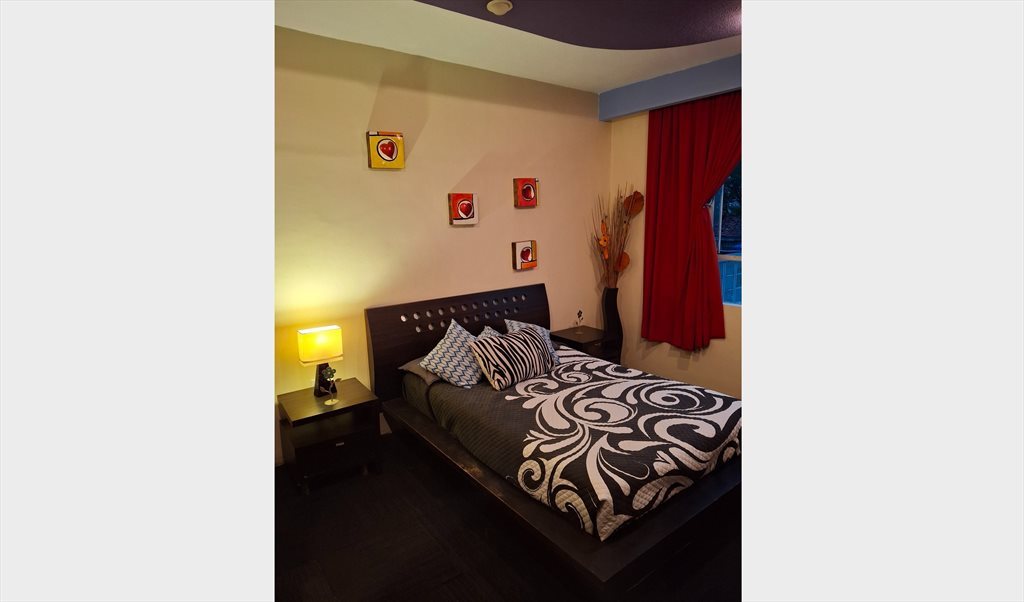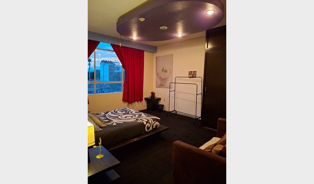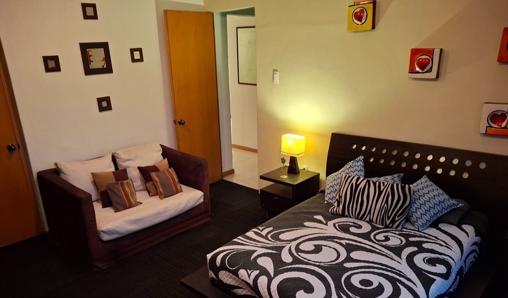 Se renta linda recamara, amueblada con una cama matrimonial, un futon para descansar, dos buros y un amplio closet de piso a techo.
