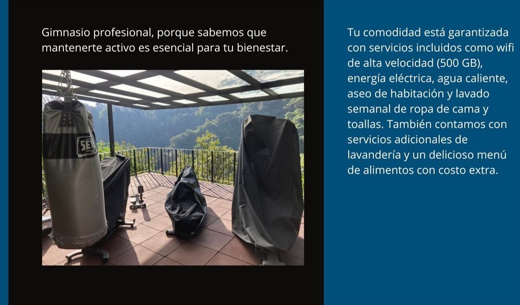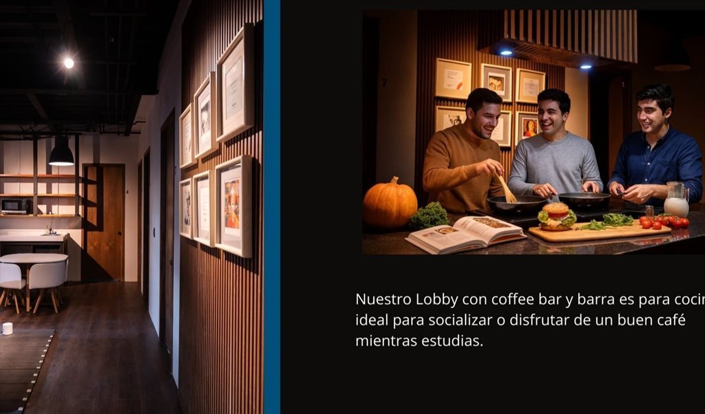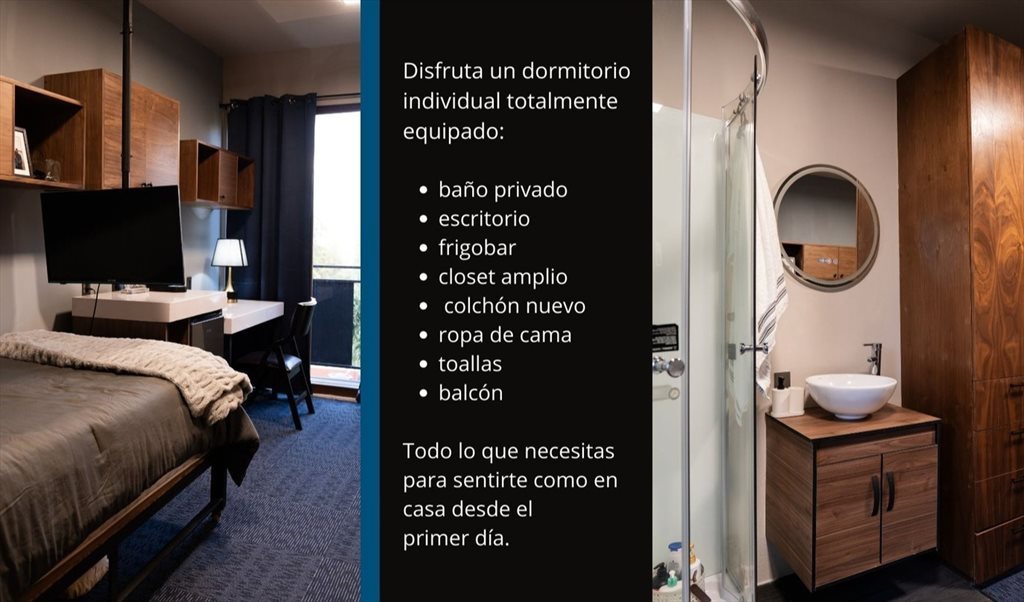 Bellos dormitorios nuevos y totalmente equipados, alfombrados, baño privado, servibar, escritorio, balcón, área de cocina y cafetería co-living, roof garden amplio para convivencia, jardín, terraza, gimnasio, aseo semanal, wifi, gastos incluidos.