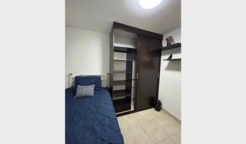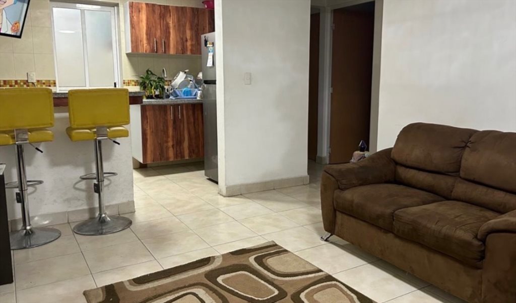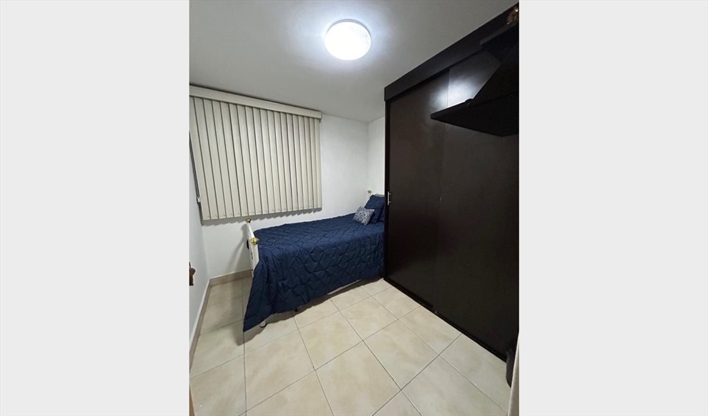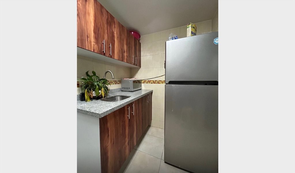 Recámara en departamento amueblado, cuenta con cocina con refrigerador, estufa y horno de microondas.