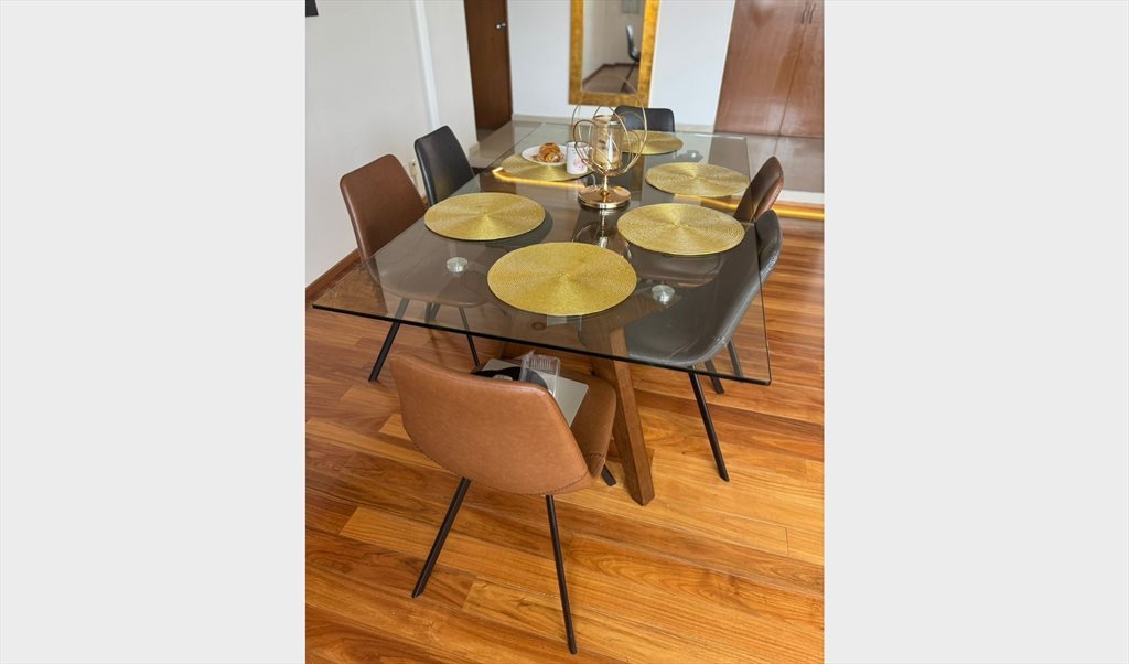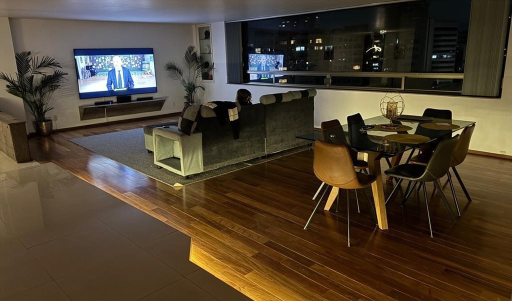 2 Salas amplias con ventanales y vista a la ciudad. TV 85" incluye Cable, Netflix, Prime y Disney+, y teatro en casa. Comedor completo 6 personas.