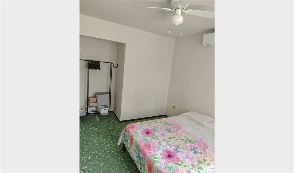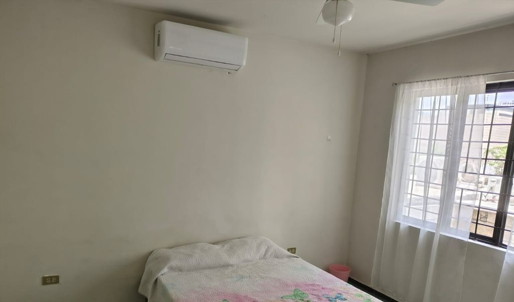 La recamara cuenta con cama, mini Split y ventilador de techo.