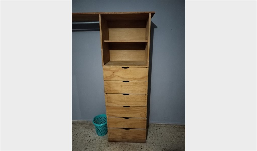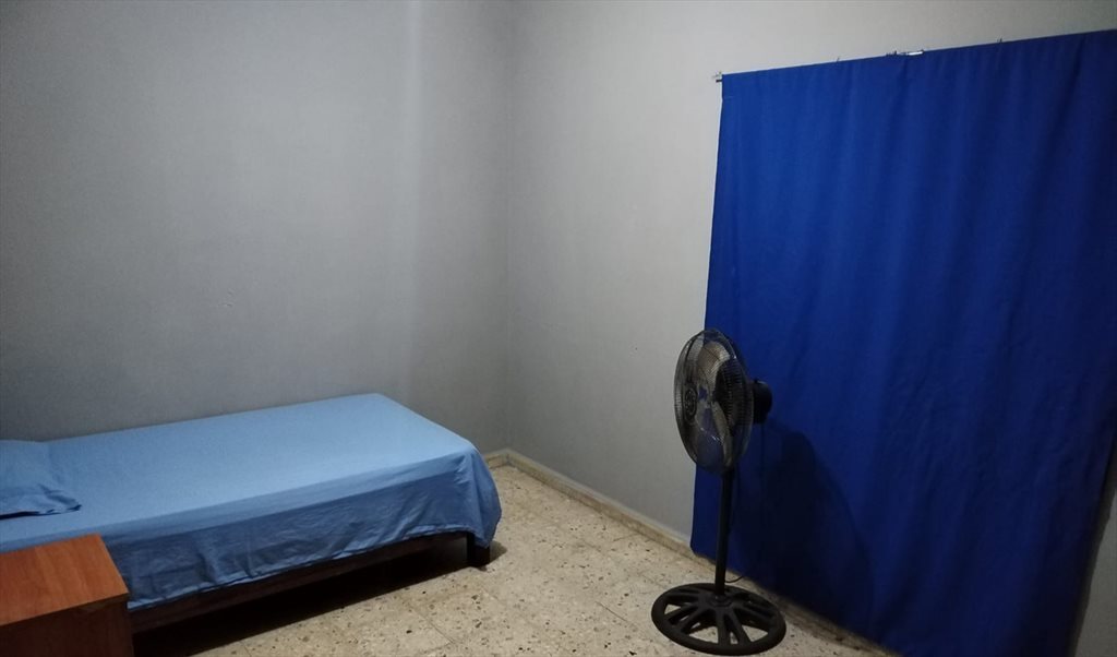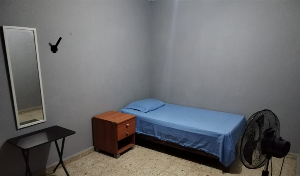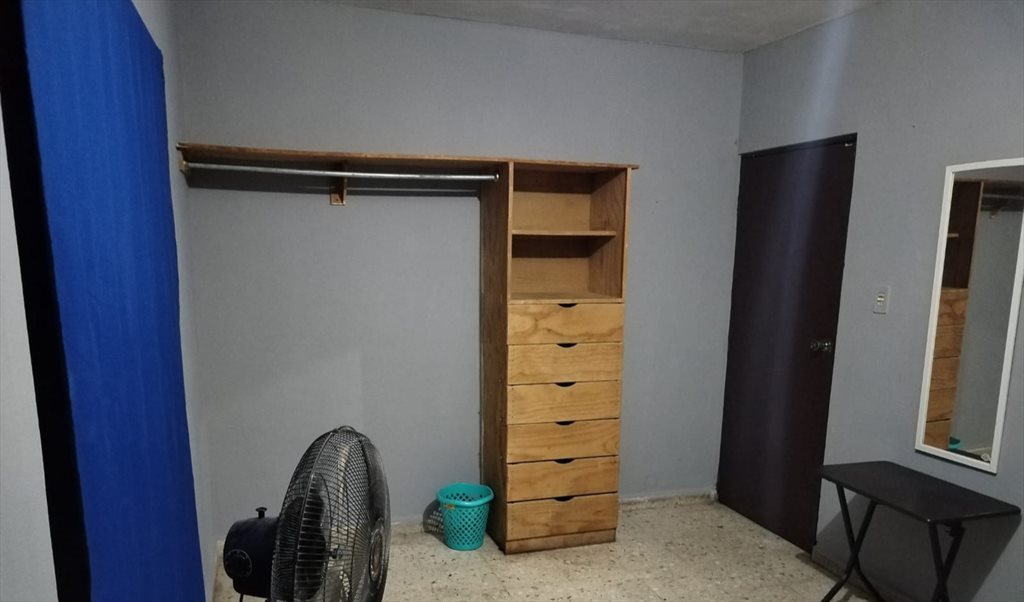 El cuarto está semiamueblado, consta de cama (individual), un buró, una mesita, un espejo grande, abanico y un closet. La habitación tiene una ventana grande que da a uno de los lados del patio.