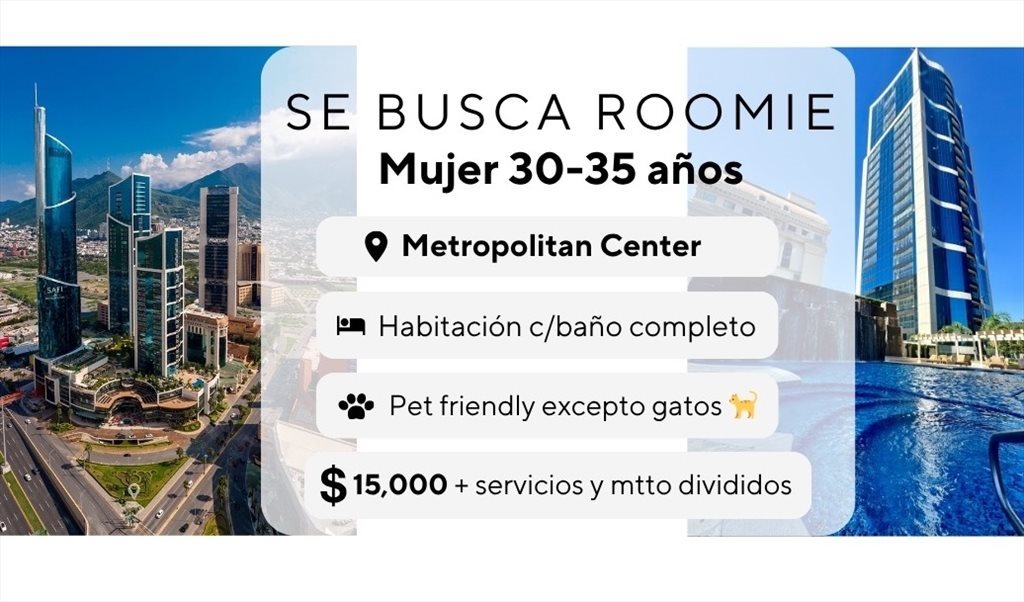 Yo viajo muchisimo así que el depa esta solo gran parte del año. El depa esta totalmente amueblado, pero la habitación disponible no. Cuenta con closet, baño completo y persianas black out. Ubicado en la mejor zona de San Pedro frente a Fashion Drive, el depa es en la Torre II y te queda super cómodo bajar en el elevador y poder ir a los restaurantes que están ahí, al cine, a jugar golf o los lugares de entretenimiento, etc.