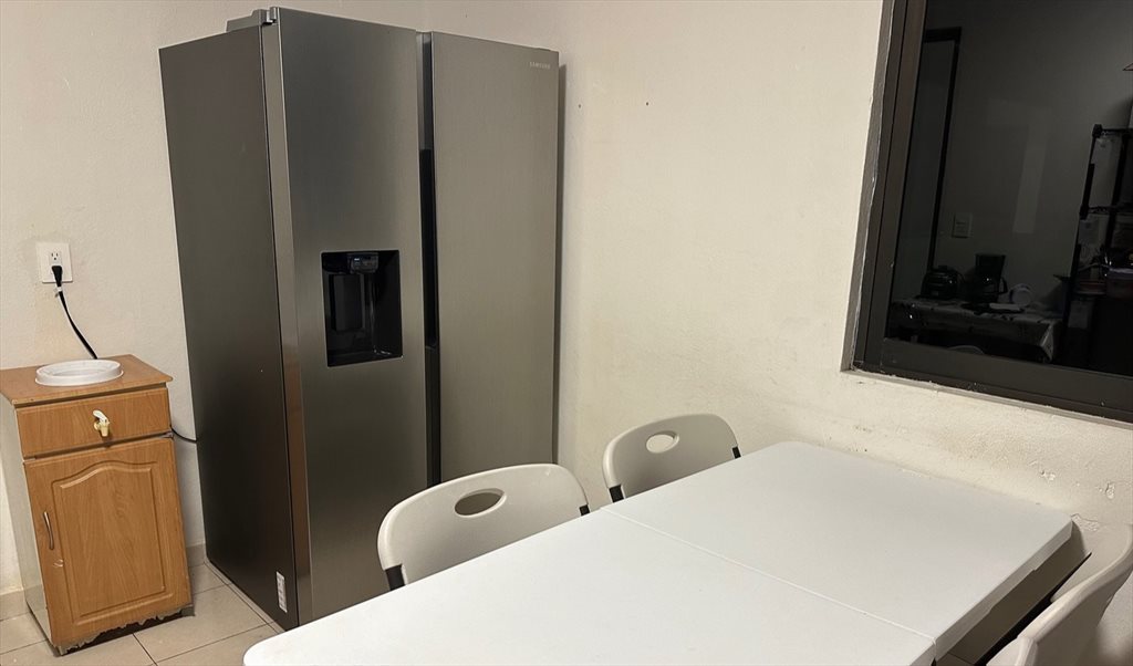 Cocina comunal con estufa, horno de microondas, alacena y refrigerador