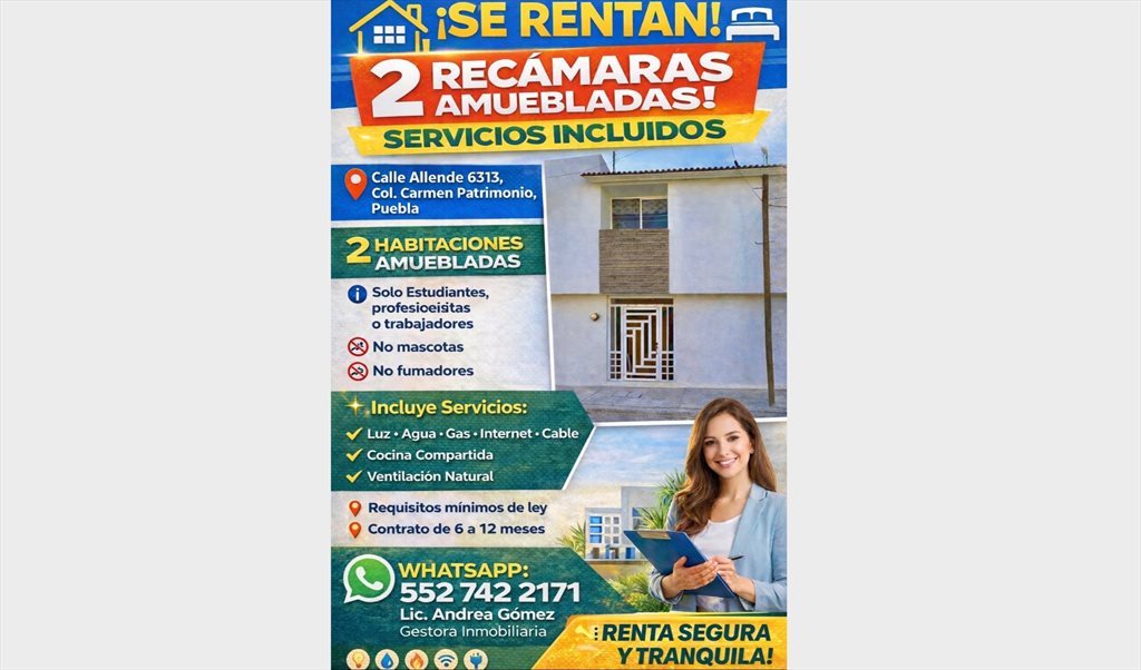 Se rentan 2 habitaciones amuebladas en una casa ubicada en una zona tranquila y bien comunicada de Carmen Patrimonio, ideal para estudiantes, profesionistas y trabajadores que busquen comodidad, seguridad y servicios incluidos. Las habitaciones están ubicadas en planta baja, con acceso independiente y derecho a uso de cocina y baño compartido.