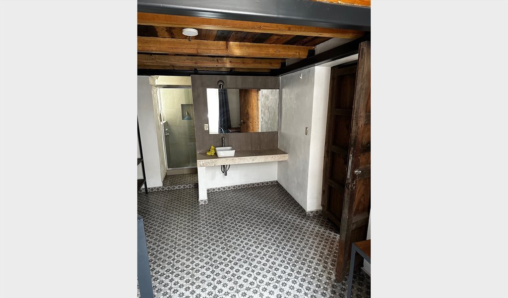 Estudio de dos plantas (tapanco de madera) en una casa con otras habitaciones rentadas, comparte cocina y áreas comunes, frigobar dentro de la habitación. Servicios de gas, luz, agua e internet incluidos, centro de lavado disponible para usar una carga a la semana, además de limpieza una vez a la semana.
