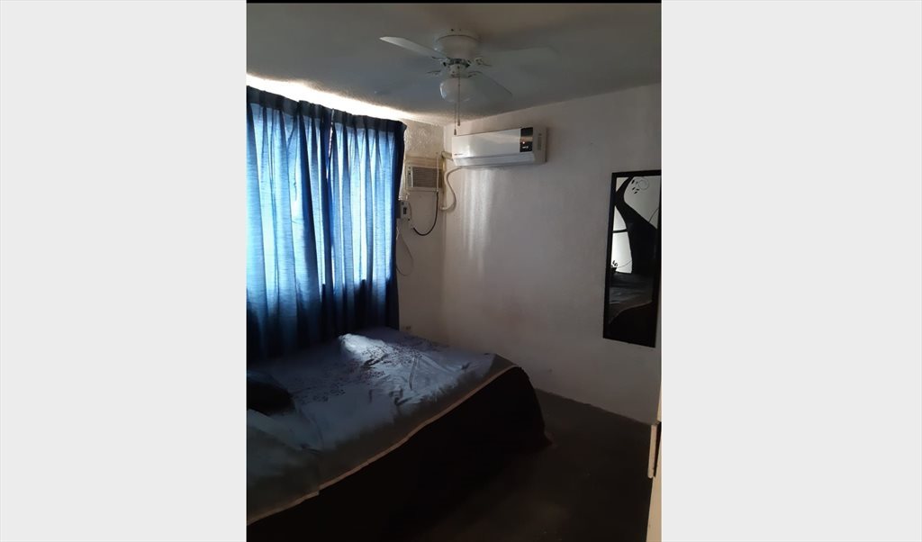 Recamara D, amueblada, cama matrimonial, ventilador de techo, closet, espejo de cuerpo completo y esa recamara tiene 1 ventana, tambien esta equipada con minisplit frio/calor para ambientar al gusto al momento de descansar. No es tan iluminada la habitacion por lo que dormir en la tarde es muy agradable.