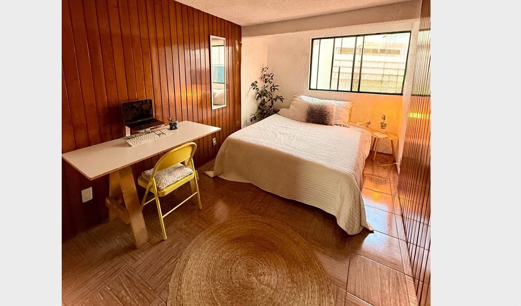 Habitación grande con clóset , en una casa con gran jardín y espacio para relax . comparte baño con 1 persona . Servicios incluidos y se divide la limpieza . Se pide depósito y mes corriente