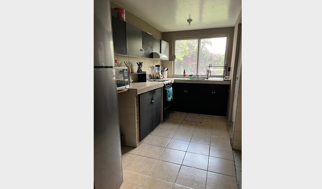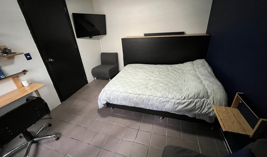 Recámara amplia con clóset (s/amueblar), con zonas comunes equipadas. Estacionamiento libre, gas natural, internet. Sin mascotas.