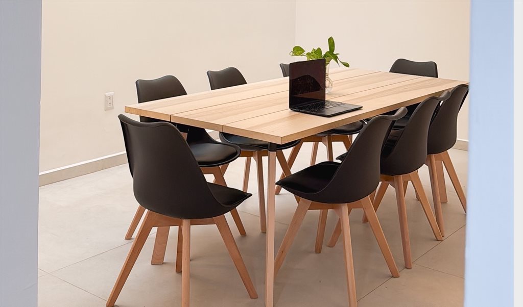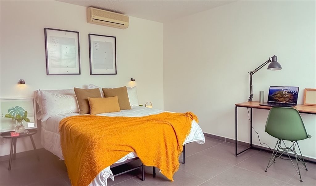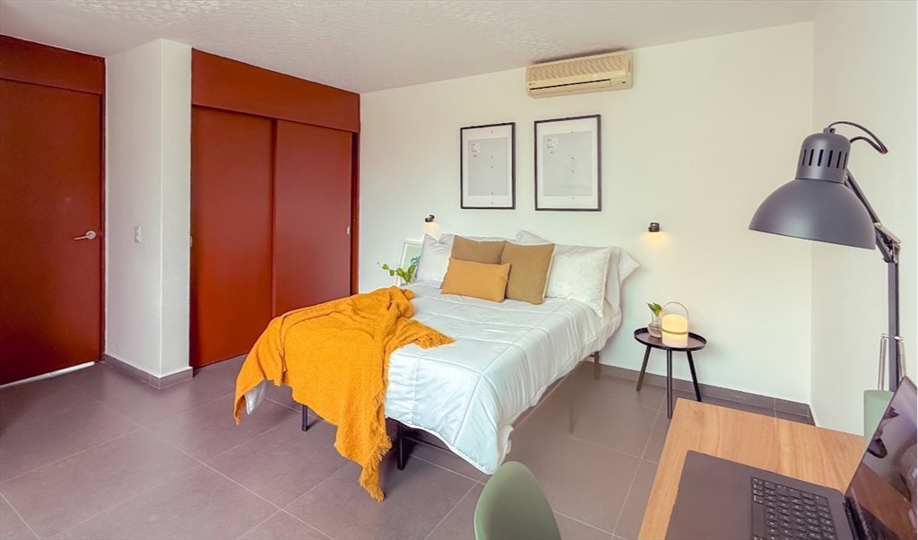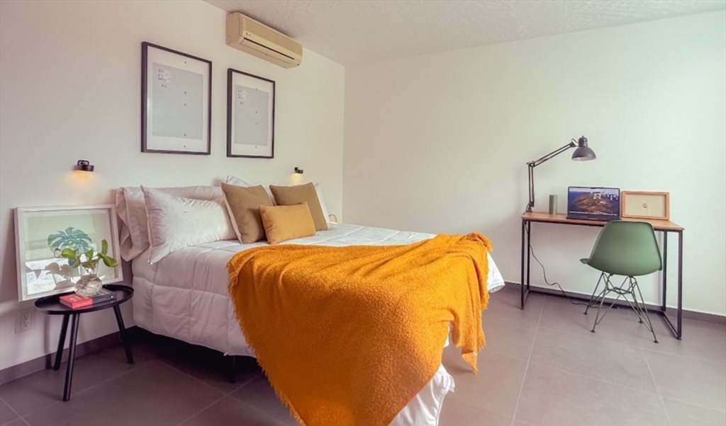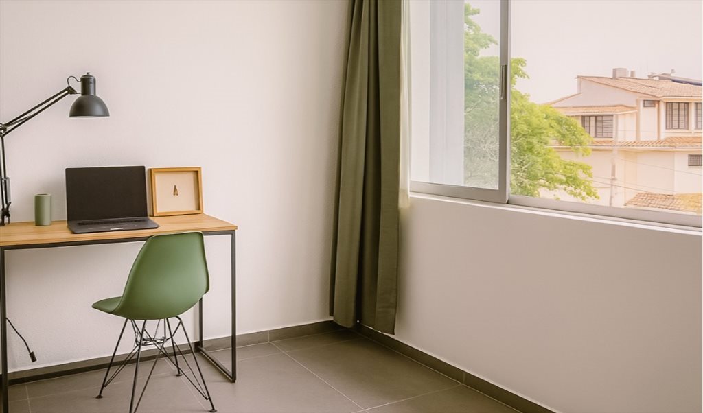 Habitación privada completamente amueblada en un coliving, con áreas comunes y ambiente tranquilo.