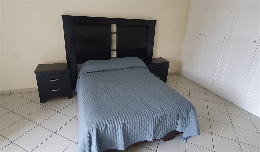 El departamento está en un 3er piso y es bastante amplio, cuenta con sala comedor, estudio, cocina, minibar y cuarto de limpieza. El cuarto está amueblado con cama matrimonial, 2 buros, tocador con espejo, tiene 2 closets amplios y ventana hacia la calle.