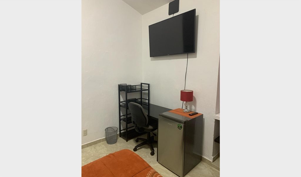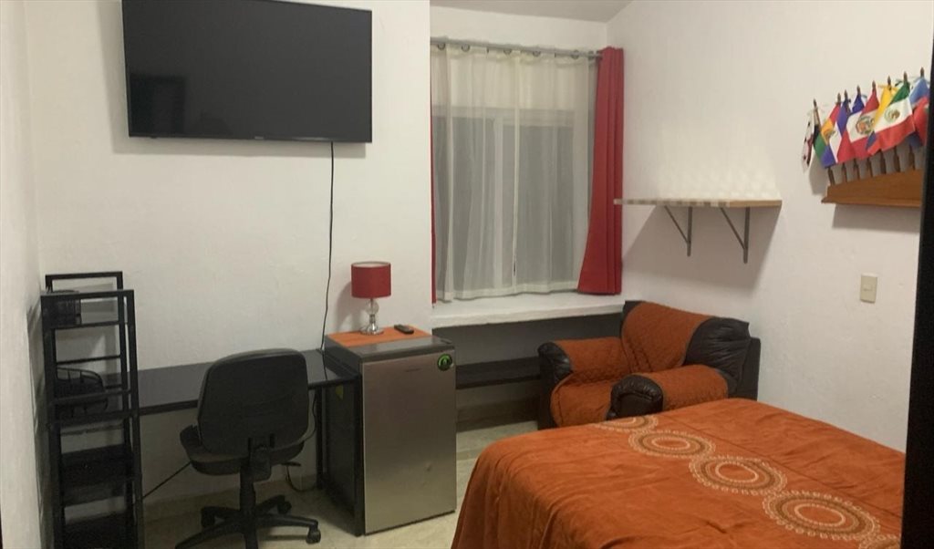 Habitación amueblada con cama matrimonial, escritorio con silla, buró, televisor, frigobar y closet, 2 juegos de sábanas de cama sin almohada.