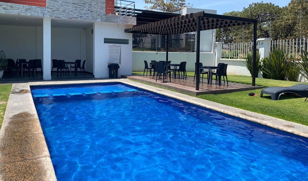 Amenidades del coto: casa club con alberca y asoleaderos.
